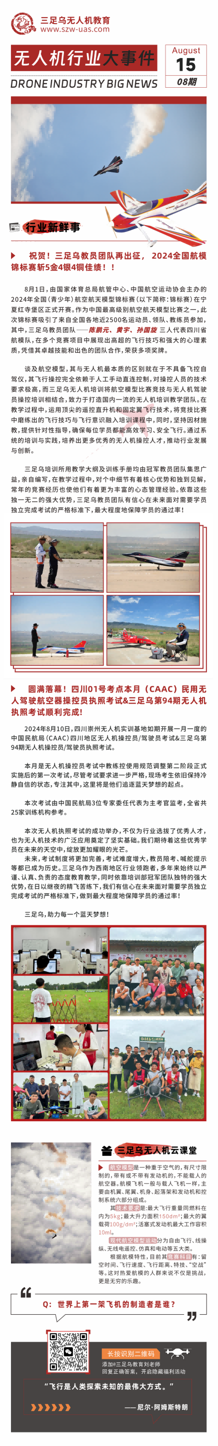 三足乌无人机教育成立于2014年,是西南地区第一家、全国第九家获得无人机操控员培训资质的企业,三足乌拥有200亩实训考试基地,专业教学设施设备,可开展全机型(多旋翼、飞机、动力升空器、直升机),全等级(视距内、超视距、教员)的课程培训;2016年起开展地区无人机驾驶员合格证考试工作,并于2018年成为四川地区第一家民航局无人驾驶航空器操控员执照考试中心(四川01),十年来,通过培训及考试服务已为行业累计输送数万名专业人才,是四川的地区名副其实的无人机操控员“黄埔军校”。